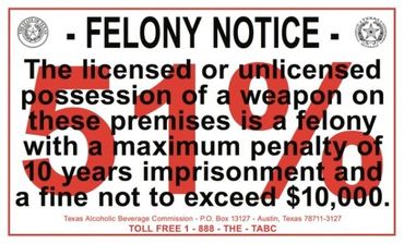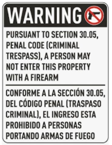 2. When I arrive someplace. Before getting out of my car, am I at a school event? If so I can't have a weapon with me even if its outside. Before entering a premises: A. Am I at a location prohibited by the State of Texas law from carrying a handgun. If not keep walking toward the building. B. At the door I look for signs. 30.06 or 51% sign I can't enter with a handgun. 30.07 sign I can't enter with an Open Carry handgun, but I can if I'm Concealed. C. Before entering has a person of authority from the premises I'm entering told me I can't be inside with a handgun? That is notification of criminal trespass.